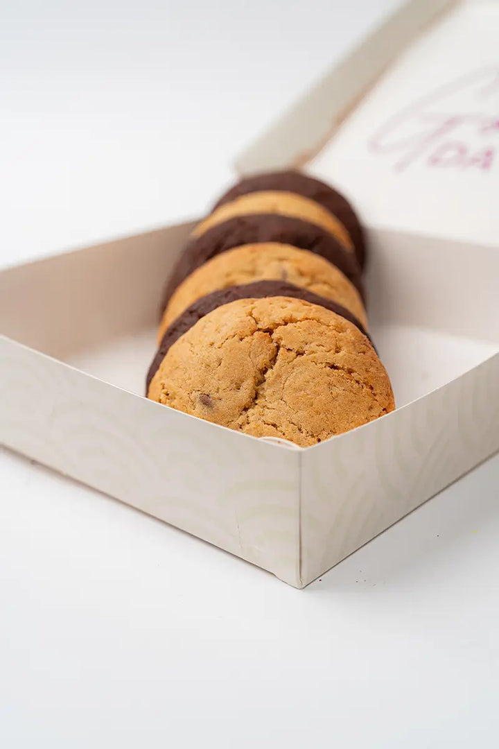 Our Mixed Cookies Box brings together the best of both worlds — 3 pieces of our Classic Chocolate Chip Cookies and 3 pieces of our Double Chocolate Cookies, each stuffed with rich Belgian milk chocolate.